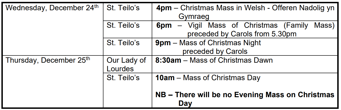 Please note the Mass Times for the Christmas period: